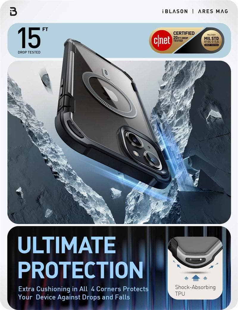 The iPhone 15 Plus I-BLASON AresMag Shockproof MagSafe Case offers superior protection for your device with military-grade shockproof technology. The MagSafe technology creates a secure connection to your phone, and the heavy-duty casing helps to reduce drops, scrapes, and other damage. Its slim design and lightweight construction make it easy to carry with you anywhere. Get maximum protection for your device with this Shockproof MagSafe Case.