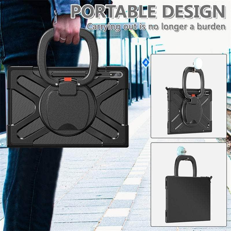 This Galaxy Tab S9 Ultra Rotation Hand Ring Stand Rugged Case is designed to provide reliable, all-around protection. It features a 360° rotatable hand ring and an adjustable kickstand for maximum ease of use. Be assured that your device is securely protected from bumps and drops.