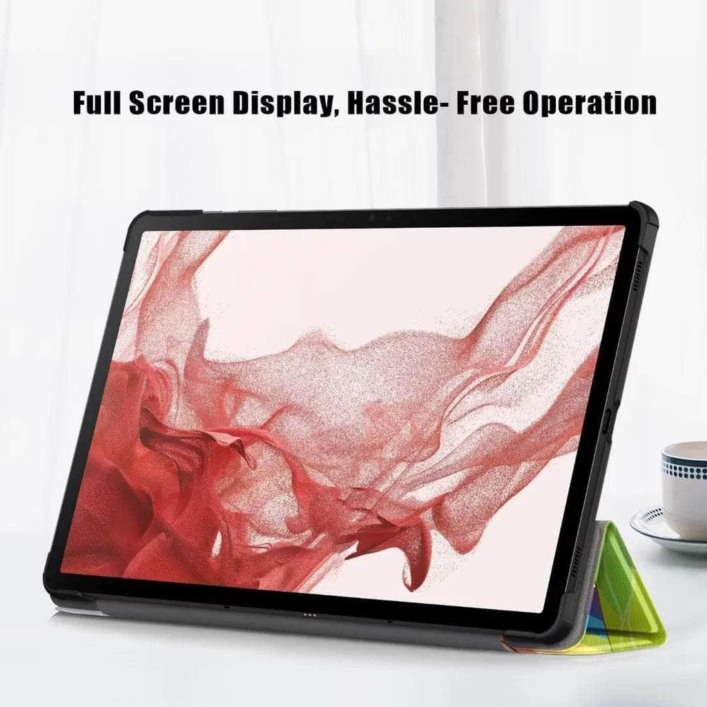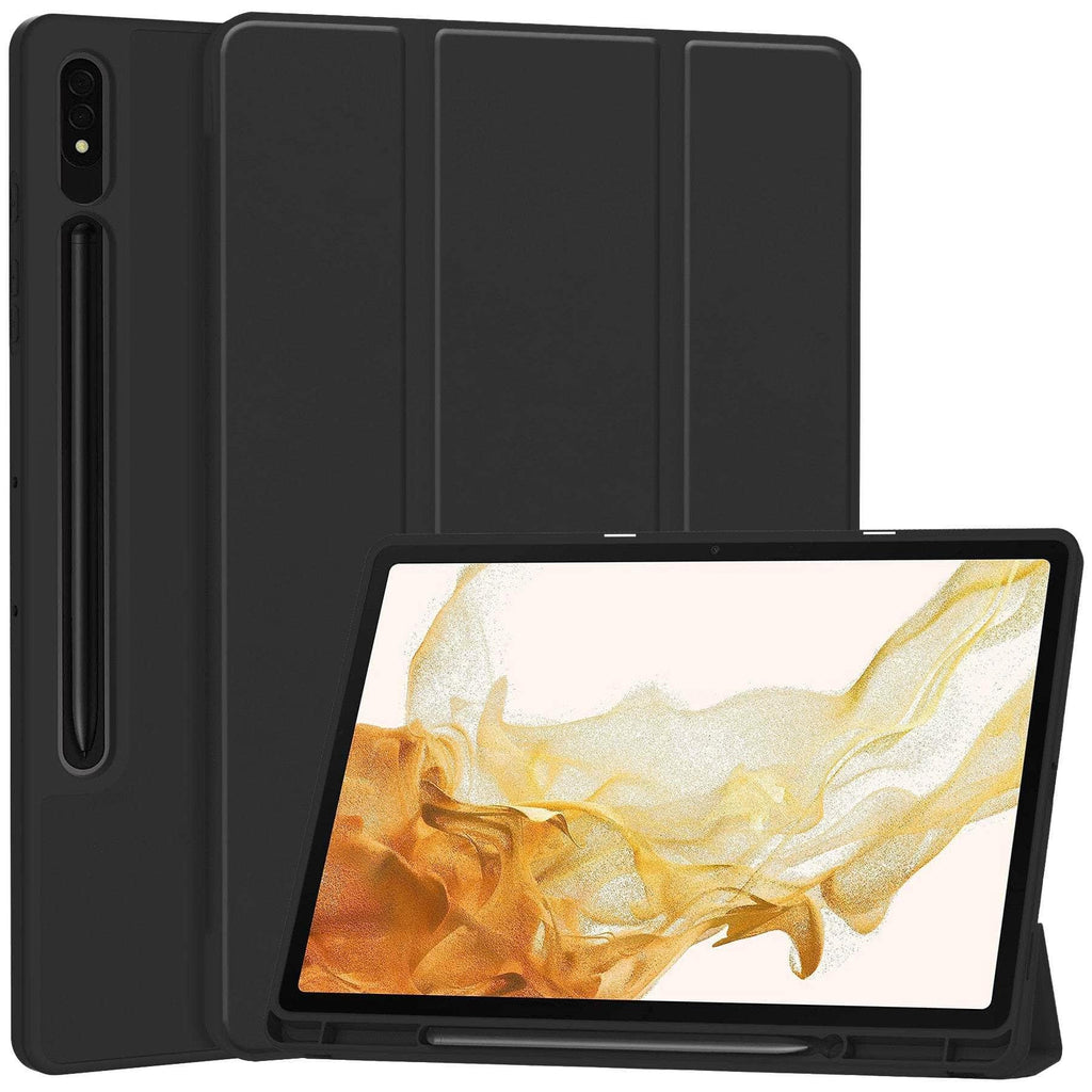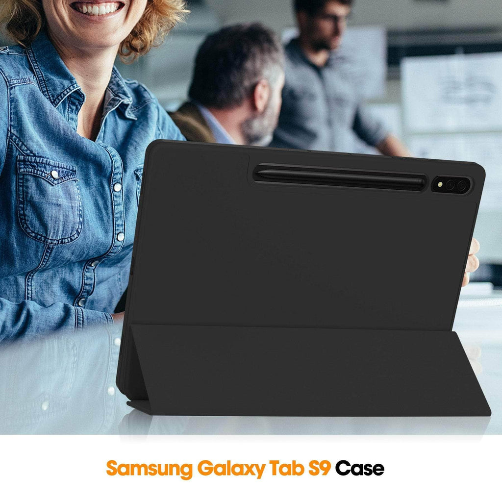 The Galaxy Tab S9 Ultra Smart Case Pencil Holder offers maximum protection for your device, allowing you to use your tablet confidently with its scratch-resistant shell and impact-resistant interior. This case keeps your device and pencil securely in place with its snug fit and easy-access pockets. Enjoy easy portability with its lightweight frame and hands-free stand.